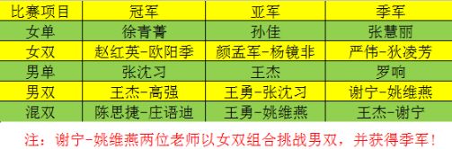 混双比赛作为参赛队伍最多的比赛,其比赛强度和激烈程度可见一斑。混双比赛对搭档的默契配合提出了很高的要求,比赛中不乏出现搭档间沟通不当而导致的失误,或是放心地把后场球交给队友处理,却反而让队友猝不及防;或是两人争着回球,到击球前一刻为避免争抢又同时收回球拍,眼睁睁看球落地而无能为力。而这些也为紧张的比赛提供了不少乐趣,让比赛的间隙多了一些欢笑。当然,比赛中让人看到更多的是老师们之间的默契配合。双打比赛向来节奏快,回合多,每一回合都需要迅速做出反应,老师们前后场分工明确,上网坚决,回防迅速果断。经过漫长的单循环小组赛,最终在决赛中,陈思捷老师和庄语迪老师的混双组合战胜了王勇老师和姚维燕老师,赢得了冠军!