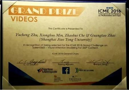 此外,张文军教授团队翟广涛及其指导的博士生朱煜程、车朝晖和博士后闵雄阔还在此次IEEE多媒体大会(ICME2018)上赢取了全景视频显著性检测挑战赛大奖(Grand Prize for Grand Challenge on Saliency360!)并获得2500美元奖金。ICME Grand Challenge是多媒体领域影响力最大的挑战赛之一,每年吸引上百个世界知名大学和公司组队参加,其目的是解决工业界面临的实际难题,由诸多世界知名公司赞助举办。