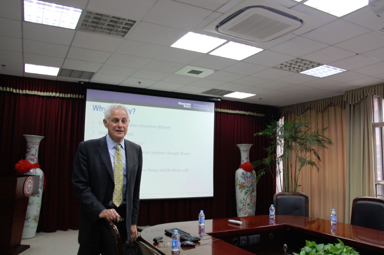 下午,Galil教授面向全院做了题为“Best education in the world: Now available to the world”的报告。我系张丽清教授、谷大武教授、申丽萍副教授等几位老师到场。报告介绍了佐治亚理工与Udacity和AT&T合作推出计算机科学硕士学位课程(Online Master of Science in Computer Science ,简称OMS CS)的情况。学生可以完全通过大规模在线课程模式获取硕士学位。通常,学生获得硕士学位需要花费45000美元,提供在线硕士学位后,仅需6600美元。课程开展以来,已有1,395名学生申请加入,其中包括30名中国学生。