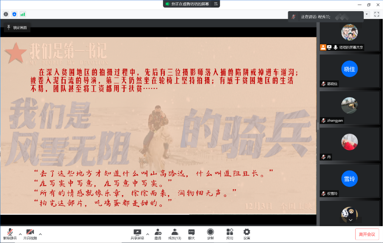 最后,支部委员韩晓佳讲述了这部电影的艺术特色和主创团队背后的故事。电影《我们是第一书记》作为对脱贫攻坚这段中国伟大创举的历史予以空前的艺术呈现,无论是其在中国特色社会主义新时代大背景下的价值意义、在人类命运共同体畅想中的文化人类学价值,还是新闻电影融合创新的表现手法,真实镜像与诗化意象有机融合的美学追求等都值得称道。它是脱贫攻坚战场上的精神丰碑,是为下一代留下可供追寻和回望的脚步与精神,是一部彰显崇高信仰力量、弘扬中国精神的丰碑式作品。除此之外,韩晓佳还向各位党员同志分享了这部影片的幕后故事,当讲到主创团队跟随第一书记亲历扶贫一线,坐在轮椅上也要坚持拍摄,并主动将工作酬劳用做扶贫工作的时候,党员同志纷纷表示,“这就是精神的力量,一个优秀的人,可以影响并带领很多人,一起走向优秀”。