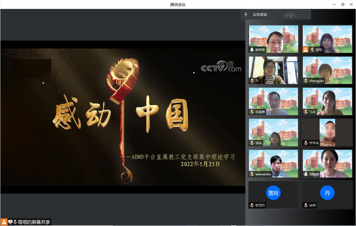 “中国人民的伟大创造精神、伟大奋斗精神、伟大团结精神、伟大梦想精神。这种伟大精神是一代一代中华儿女创造和积淀出来的,也需要一代一代传承下去”。在“红色五月·处处见初心”主题学习月活动的推进过程中,“倾听历史回响 发现中国精神”也是本次主题月的重点学习内容之一。为此,AEMD平台直属教工党支部以习近平总书记考察中国人民大学时发表的重要讲话精神学习、习近平总书记给南京大学留学归国青年学者回信精神学习、历年《感动中国》获奖人物事迹学习为主线,开展“梦想里有家、有国、有天下”专题分享。