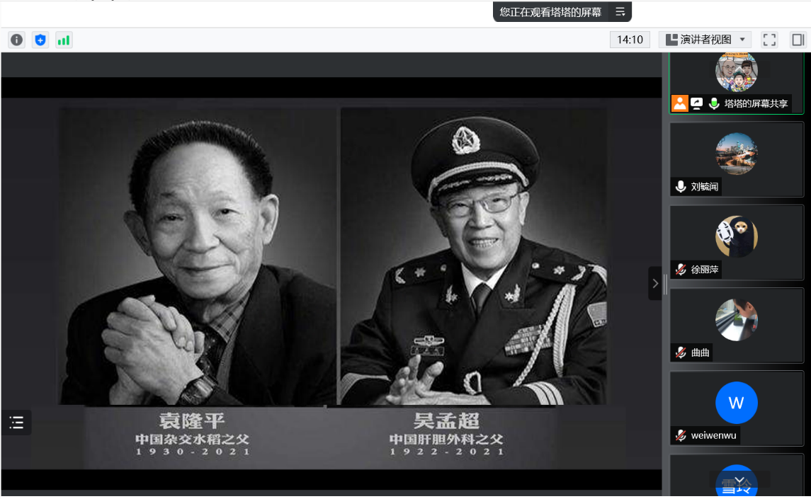 在《感动中国》获奖人物事迹学习中,平台党员围绕袁隆平、吴孟超、钱学森、顾诵芬等同志的伟大事迹展开学习,并围绕“科学家精神”的内涵展开讨论。老一辈科学家的人生历程中,有着时代的烙印、有着历史的回响、有着与国家民族命运休戚与共的信念,他们把人生理想和中国梦融为一体,在砥砺奋斗中放飞青春梦想,以俯首甘为孺子牛的艰苦奉献书写人生华章。