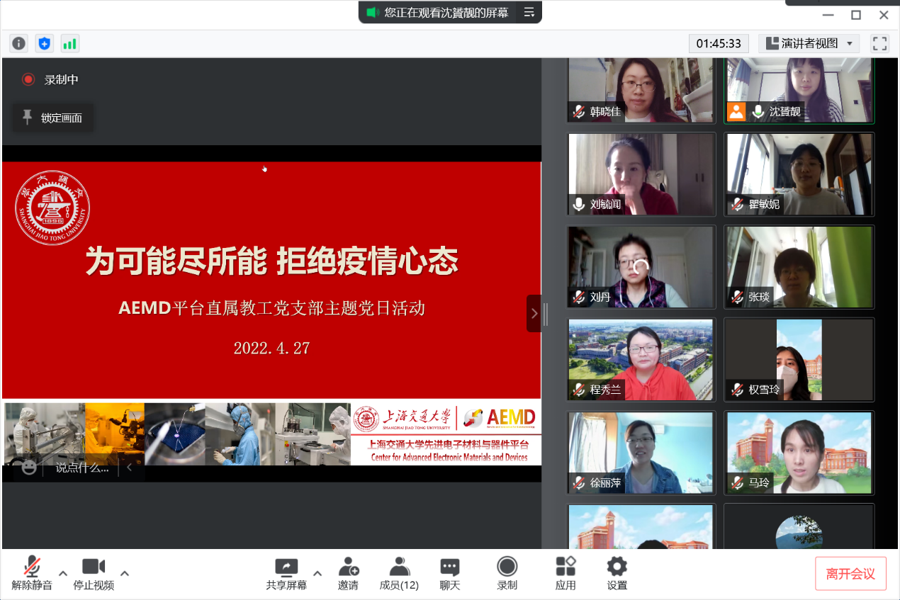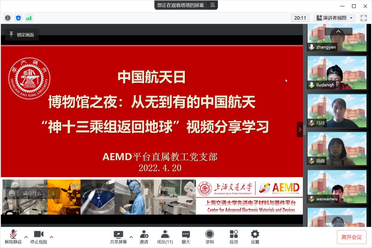 与会党员纷纷表示,国家安全涉及方方面面,信息安全、网络安全、环境安全、社会安全、文化安全等等均囊括其中,安全无小事,作为AEMD平台的一名党员,既要有时刻保证实验室安全的自觉,也要有全面维护网络安全、信息安全等的意识和能力。在观看教育片《初心——家国》后,其中所折射出的各行各业的家国情怀同样深深触动了党员同志。平台主任程秀兰表示,“每一座巍峨壮美的雪山都是由一片片雪花堆积而成的,涓涓细流终会汇聚成河,作为党员,我们要团结一心、冲锋在前、争党表率,坚决把责任扛起来,为夺取抗疫斗争胜利贡献力量”;平台党员徐丽萍表示,“一代人有一代人的长征,每个时代都有独特的主旋律,作为党员应始终心怀‘国之大者’,真正聚焦时代关切,坚持情系民生福祉,怀着这样的初心深入实践,努力讲好中国故事”;平台支部书记刘毓闻表示,“上海处在防疫攻坚战的关键时刻,正是党员同志应当有令必行、尽锐出战、维护社会安全的时候,不论是参与社区志愿服务,还是利用专业所长为抗疫提供支持和帮助,都是身为一名党员义不容辞的责任,党员同志要把家国情怀融入不懈奋斗,以实际行动,营造‘国家安全、人人有责’的良好社会氛围”。
