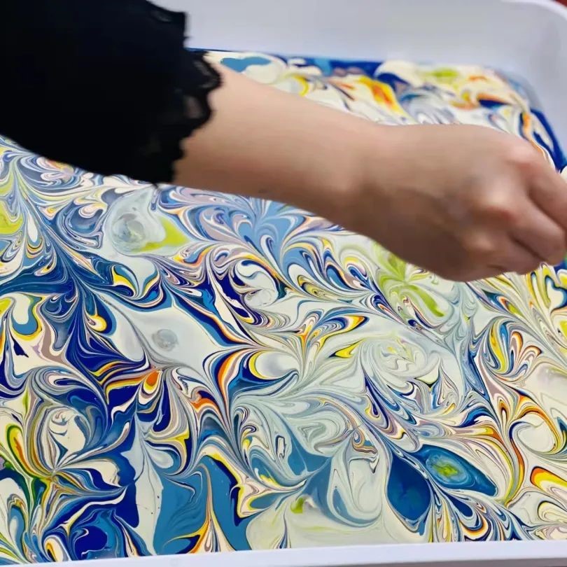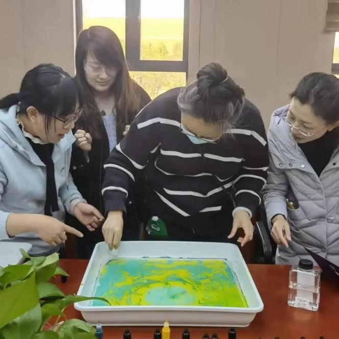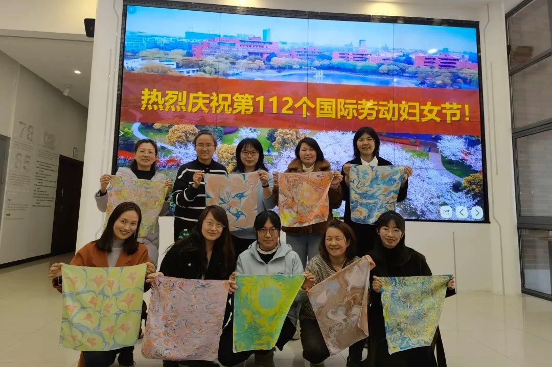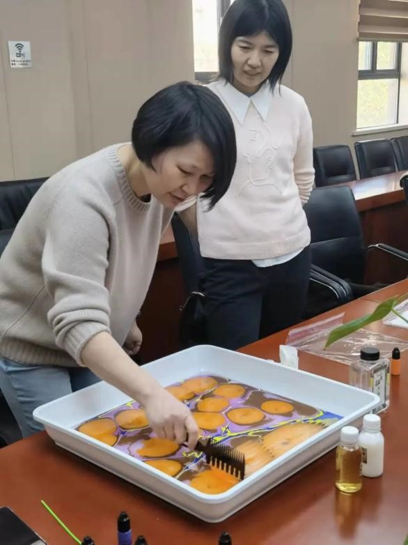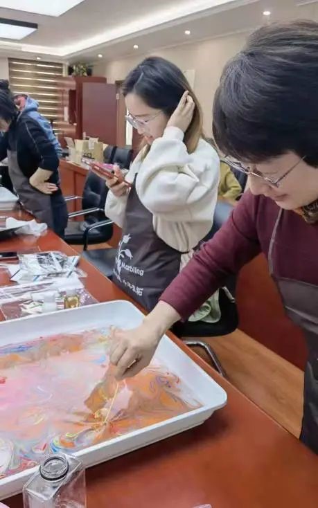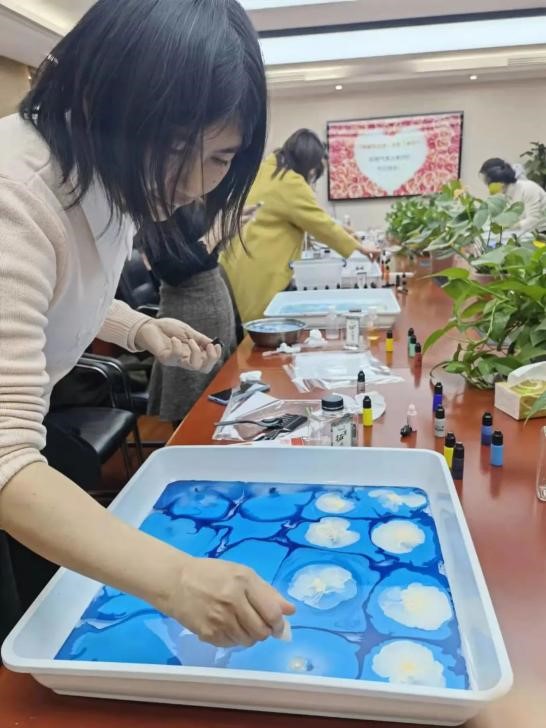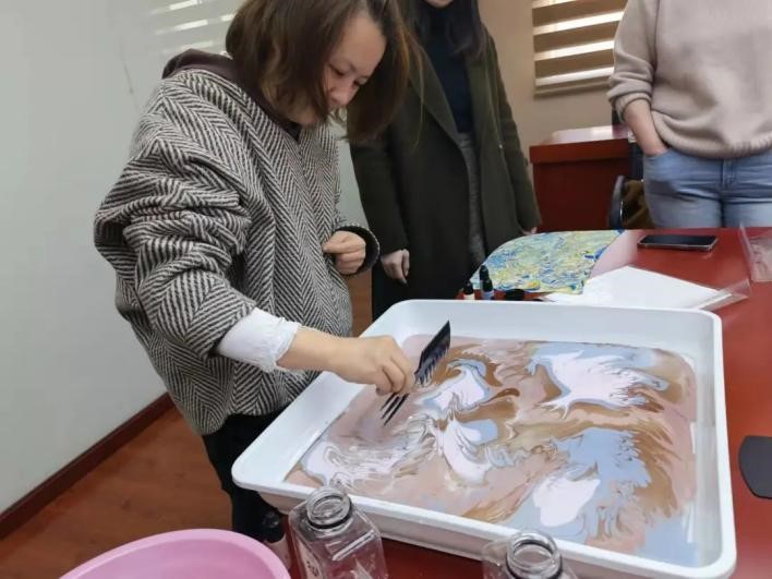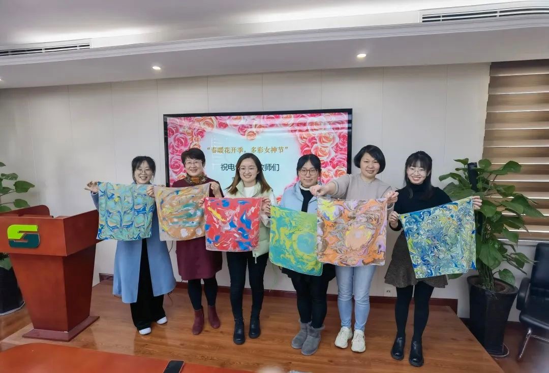 水拓丝巾活动在智能电网楼大会议室举行。颜料入水,随波晕开,画针轻挑,旖旎万千,这就是缘起于丝绸之路的神奇水拓丝巾。当一方纯白丝巾覆盖在水面画作上,精心勾绘、随性涂鸦的画面,从此变成一条个性十足、独一无二的典雅丝巾。学习、观摩、上手点墨、制作图案、丝巾入画、烘干定型,一步步工序在春日暖阳的映照中挥划出一道道鲜明绚烂的色彩。一条条飘逸优雅的丝巾,汇聚成了女教师们手中最亮丽的风景。