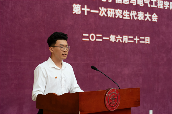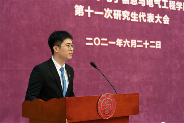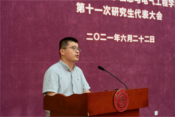 第十届研究生会主席团成员陈曦向大会作题为《风华正茂,接续百年奋斗;勇担重任,启航青春征程》的工作报告。从学术科研、文体活动、学生服务、就业实践、思想引领和公益志愿六个方面回顾了本届研究生会的工作,希望研究生会引领同学们立大志、明大德、成大才、担大任,为党的百年华诞献礼。