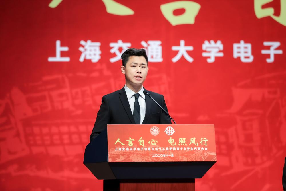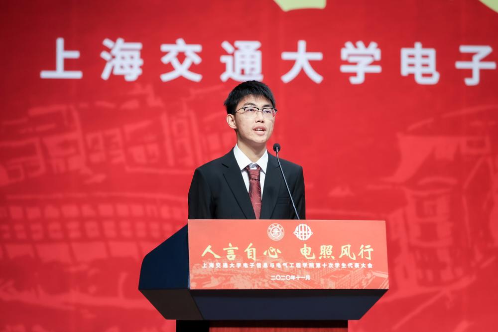 高宇岑代表校学联致辞。他表示电院学子群英荟萃,在学科竞赛、创新创业等领域中均取得优异成绩,希望能通过学代会让各位代表共同参与校园文化建设,为学校、学院的发展壮大不懈努力。