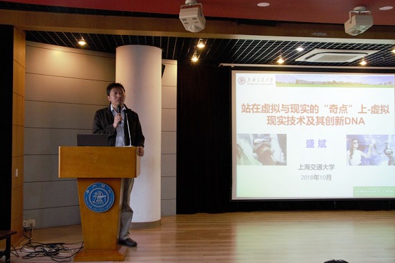 盛斌作了题为“站在虚拟与现实的‘奇点’上——虚拟现实技术及其应用”的特邀报告。盛斌教授从事计算机图形学与虚拟现实、可视媒体与数据可视化技术等领域的研究,对当下热点“虚拟现实”拥有着深入而独到的见解,引起了同学们的强烈兴趣。