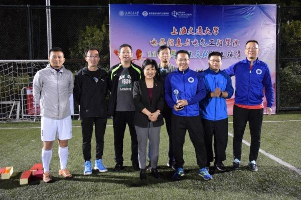 六场激烈角逐后,决出了本届赛事的最终战果:电院老男孩队、电院小伙伴队和电院小鲜肉队分获冠亚季军,电院老师傅队获得了公平竞赛奖,电院小伙伴队8号李喆老师以三粒进球荣获本届赛事的最佳射手奖。学院副书记杨一帆书记到场为各队一一颁奖,并致闭幕辞,为本届电院110周年“院庆杯”足球赛画上了一个圆满的句号。