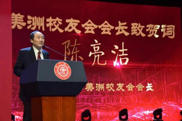 交通大学美洲校友会会长陈亮洁先生致贺词。他表示,多位电院前辈在交大与美洲交流中做出了杰出贡献。一日为交大人,终生为交大人,美洲校友会将继续助力上海交大迈进世界一流大学行列。他衷心祝愿电院院庆圆满成功,祝愿电院早日建成中国特色世界一流学院。