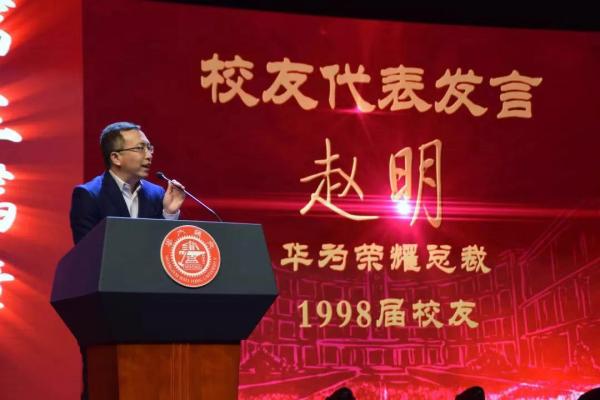 华为荣耀总裁、1998届毕业校友赵明学长作为校友代表发言,他向院庆110周年表示热烈的祝贺,对于110年电院取得的辉煌成绩感到骄傲和自豪,赵明回顾了自己在交大电院的求学经历对于自己人生以及职业生涯的影响,在华为公司工作的经历以及取得的成绩。赵明对电院的老师们表示感激,并期待未来华为与电院有更深度的合作,期待学院的研究力量与企业联盟,共同提高竞争力。