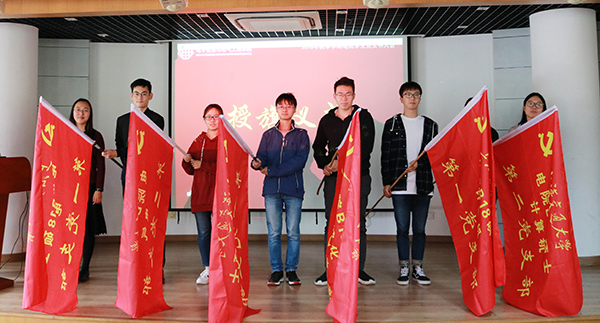 新学期电院学生党总支迎来新鲜血液,田怡萌和梁玉杰为新成立的1418级硕士生支部进行授旗,欢迎他们加入电院学生党总支大家庭。