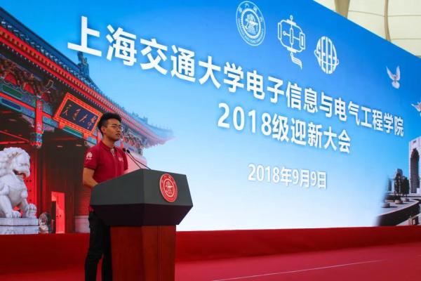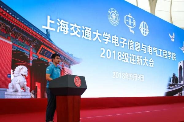 电院2018级熊宇轩作为新生代表发言。他首先对多年来默默付出的家长和老师表示感谢,告别曾经的温馨记忆。眺望未来,他提到两个词:独立及使命。他表示迎新大会意味着同学将离开父母,在交大展翅翱翔,而作为电院人,更应当主动承担起对祖国,对母校,对自己的使命。
