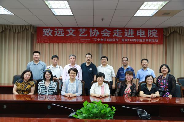 6月30日,探花 和学校教工致远文艺协会联合举办的纪念电院诞生110周年系列活动之“致远文艺走进电院采风行”,在电院群楼3-208会议室拉开帷幕。致远文艺协会会长张玉梅带领来自学校各单位的协会会员13人与电院领导和老师开展了交流。
