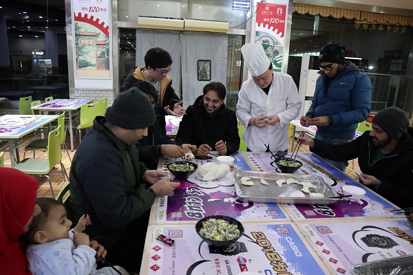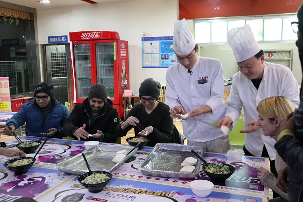 首先,由食堂师傅们亲自示范,为留学生们传授包饺子的基本技巧和手法。随后,大家发挥各自的能力和手工技巧,亲身参与到了包饺子的过程中。在食堂师傅的指导下,留学生们都初步学会了包饺子,看着一个个像模像样的饺子出现在盘子中,留学生们都体会到了其中的乐趣。