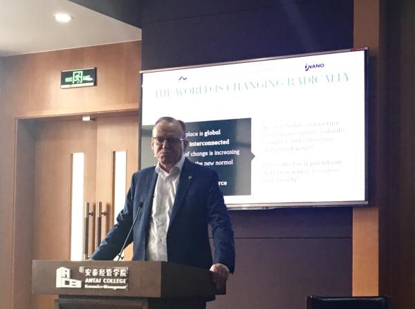 此外,20日上午,Besenbacher教授还作为特邀嘉宾在由上海交大主办的全球新工科教育论坛上做了题为“Global Challenges: from science to solutions” 的演讲。演讲中,Besenbacher教授列举了当前全球面临的危机与挑战,比如能源枯竭、环境污染、健康危害等,并重点强调了应用科学技术来解决当前问题的策略和方法,进而提出“education 4.0”新工科教育理念,认为未来工科教育的发展应该更多的以解决全球问题为导向,打破专业壁垒,鼓励多学科基础融合的新教育模式。