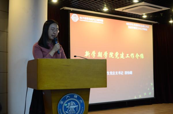 田怡萌首先对新学期电院党建工作规划进行了介绍。根据党中央推进“两学一做”学习教育常态化、制度化的工作要求,新学期电院将继续加强对基层党组织建设工作的支持力度。她指出,电院各学生党支部将遵循学校的相关工作指南,建立每月一次的主题党日制度并开展活动。随后,田怡萌介绍了电院学生党建组织的发展过程。如今的党建研究会是经过精心筹备,围绕学校和学院的党建工作的新要求进行更名重组,希望助力学院搭建多渠道、多层次、全方位的学习教育体系,营造浓厚的理论学习氛围,积极传递正能量,而不断进行新思考、新定位和新改变的结果。田怡萌勉励大家立足实际,使各项工作能更加接地气,做“顶天立地”的党建人。