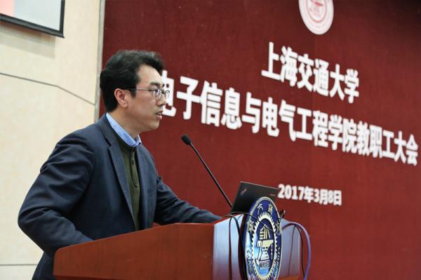 党委书记苏跃增传达了学校春夏学期干部大会的重要精神,从党的领导与党的建设、师资队伍建设、创新人才培养、科学研究与学科建设、国际合作与交流、地方合作与社会服务、管理服务与校园文化7个方面传达回顾了学校2016年工作,并向与会教师详细介绍了学校2017年的重点工作部署。此外,会上做了学院2016年度财务报告,从2016年资源收入及决算、运行经费收支情况两个方面对电院的财务情况进行客观阐述,更好地保障了广大教职员工对学院工作的知情权。