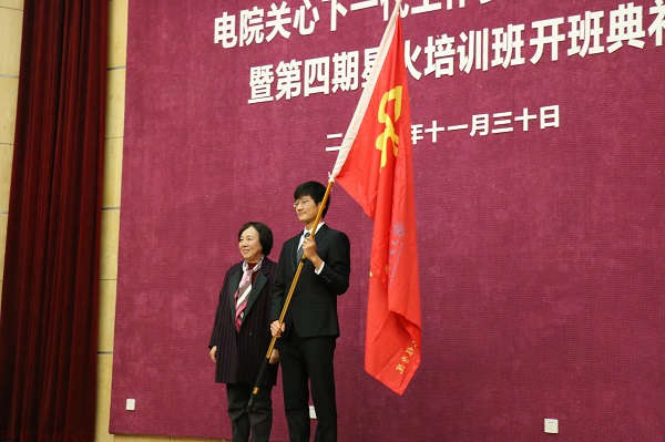 随后进行了电院第四期“星火”培训班授旗仪式,第四期星火培训班班长陈嘉梁从王绍平手中接过“星火”培训班班期,宣告第四期“星火”培训班正式开班。