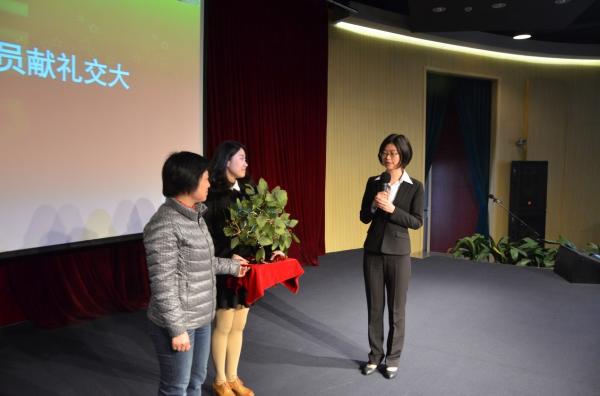 紧接着,在同学们观看电院7个系的导师代表们对硕士毕业生党员的寄语视频之后,16届学生代表杨丽雯代表全体硕士毕业生党员向学院献上挂满了祝福之叶的“祝愿树”,表达了同学们对导师、对母校的点滴怀念,以及对即将到来的交大120周年校庆的祝福。