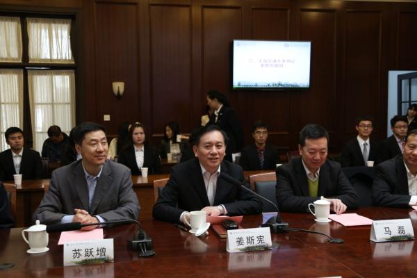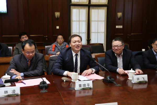 姜斯宪首先对董增平校友一行表示欢迎,他感到非常欣慰,董增平校友在施展才能,为国家做贡献的同时不忘饮水思源,正像他们公司的名字一样,慷慨捐赠,支持母校发展。在交大120周年校庆即将到来之际,越来越多的校友关心、支持母校,其中之一便是支持母校的人才培养,捐赠基金。一流的师资需要有与之相匹配的待遇,学校一定会善款善用,把基金用好,更好的实现“学在交大”的愿景目标。最后,姜斯宪代表学校欢迎广大校友在校庆之日返校,为母校共庆生日、共展未来。
