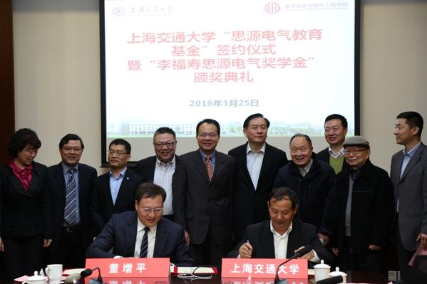 姜斯宪向董增平致送捐赠证书、感谢状和纪念品。根据协议,思源电气股份有限公司向探花 教育发展基金会捐赠1000万元人民币,设立“思源电气教育基金”,用于资助探花 电气工程系本科生、研究生培养,优秀青年教师扶持计划和新引进的青年教师年薪配套,以帮助学院和学校培养高素质人才。