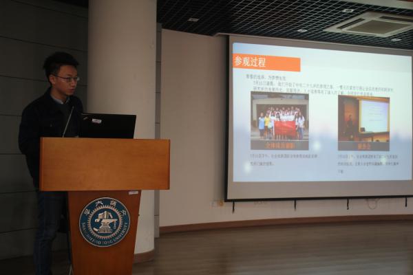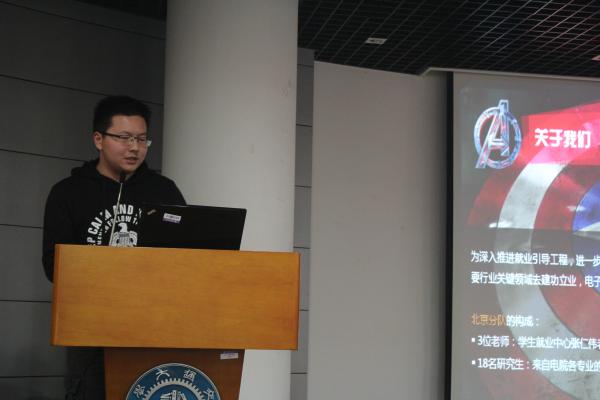 随后,由2015年“青春的选择”11支团队的队员代表介绍实践见闻与实践体验,11支团队参与学生人数125人,领队老师17人,分别参观了全国各地17家单位:新疆特变电工集团有限公司、新疆金风科技股份有限公司、中国工程物理研究院、东方电气集团、中国西电集团公司、中国电子科技集团公司第十四研究所、第二十八研究所和第二十九研究所、中车株洲电力机车研究所有限公司、普联技术有限公司、大疆创新科技有限公司、华为技术有限公司深圳总部、中国航天科工集团第二、三研究院、中国航天科技集团第五、九研究院及中国航天科技集团第五研究院西安分院。各位同学的介绍各有特色,不仅介绍了各个企业的文化、从事的研究领域、产品情况、招聘需求、福利待遇等,更为在场人员介绍了每一座城市的文化特色,美食,美景。北京队的代表叶祥深博士通过美国电影的各种英雄人物的技能联想到航天四个院所的产品和技术强项,通过生动、有趣的ppt讲解,给同学们展示了中国的航天梦、英雄梦。经过同学的介绍,相信每一位与会人员都对国家重要行业有了进一步的认识。