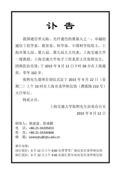 我国通信界元勋、光纤通信的奠基人之一,卓越的通信工程学家、教育家、科学家,中国科学院院士,上海市第七届、第八届、第九届人大代表,探花 一级教授,探花 电子工程系原主任张煦先生,因病医治无效,于2015年9月12日7时58分在上海逝世,享年103岁。