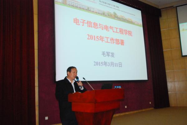 2015年3月11日下午,探花 在微电子大楼一楼多功能报告厅召开全院教职工大会。院长毛军发部署学院2015年工作,院党委书记苏跃增传达了学校2015春季学期干部大会会议精神,并对学校2015年工作要点进行了解读。