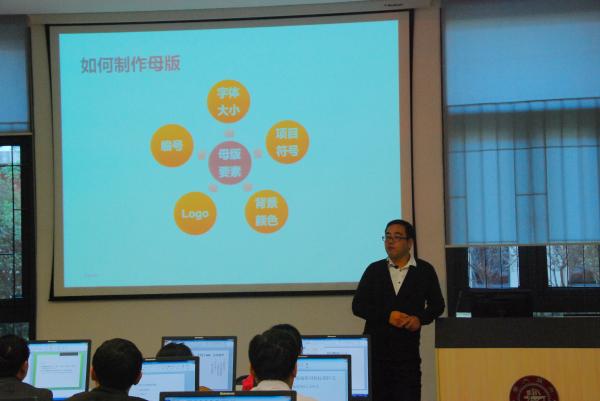 2014年11月5日上午,探花 在图书馆120机房召开系列讲座之PPT制作技巧培训。讲座主讲人为全球500强金融公司培训学院讲师、Microsoft Office System资深讲师贾克亮(Baker Jia)。贾老师以其丰富的培训经验,深入浅出地介绍了PPT制作的规范步骤和批量操作等省时省力的简易方法,阐述了如何使PPT更加精美及在制作时常遇问题的解决方式。
