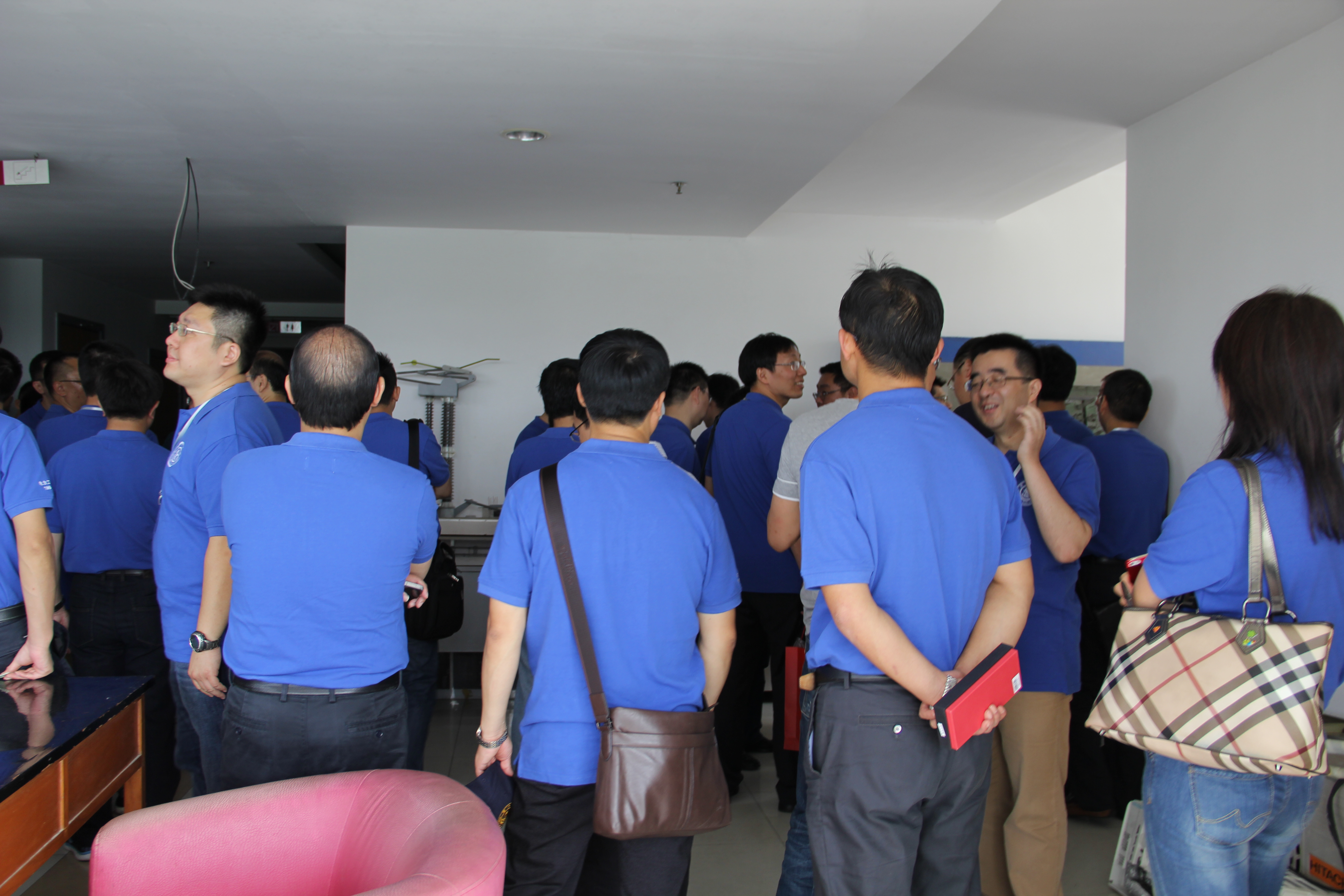 是什么让电气系办公楼道里这么拥挤?原来校友们在围着一台旧的高压输变电线路模型展开讨论。