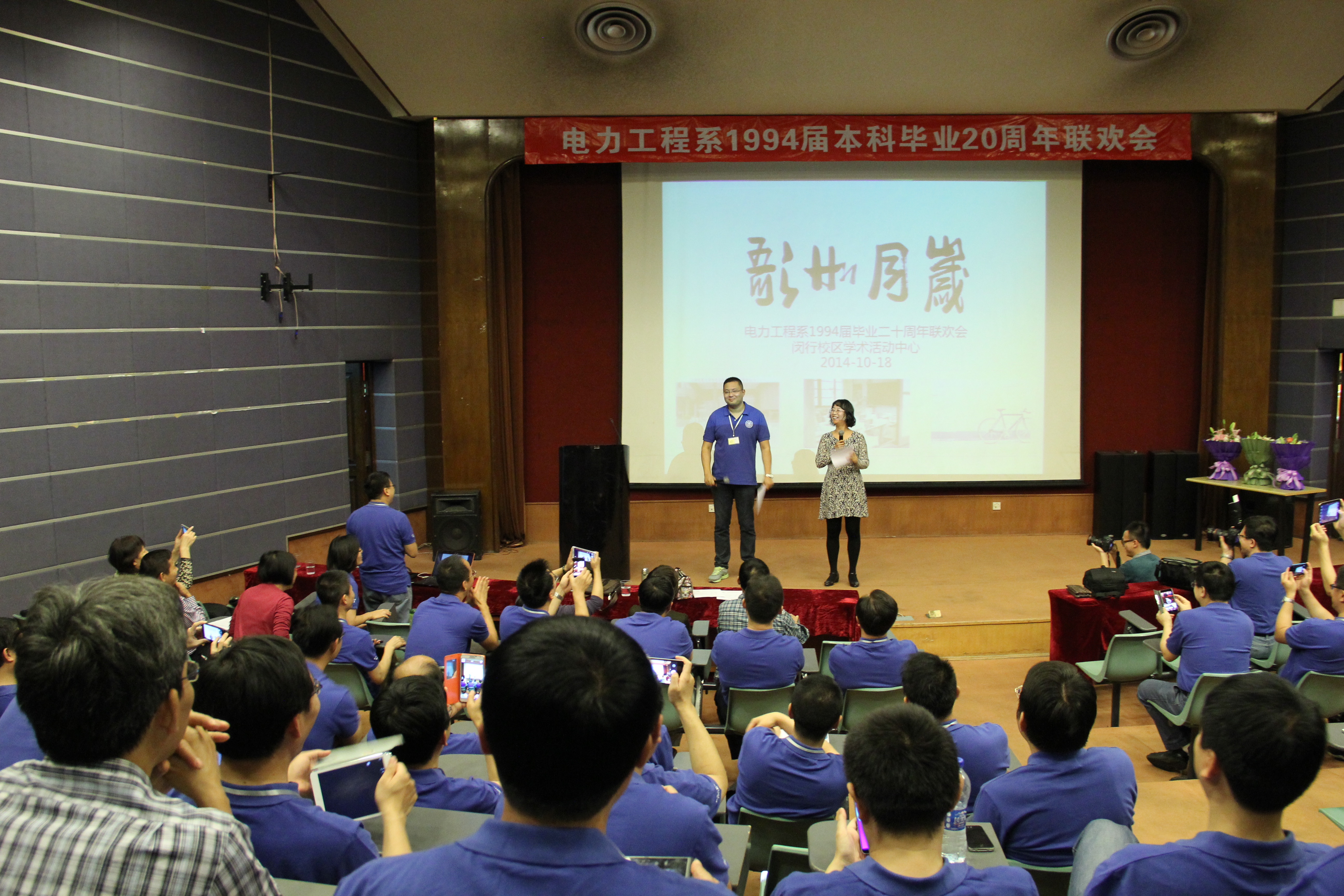 伴随银屏上一张张老照片不断滚动,电力工程系94届本科毕业20周年联欢会“岁月如歌”主题文艺会演在学术活动中心演讲厅拉开序幕。
