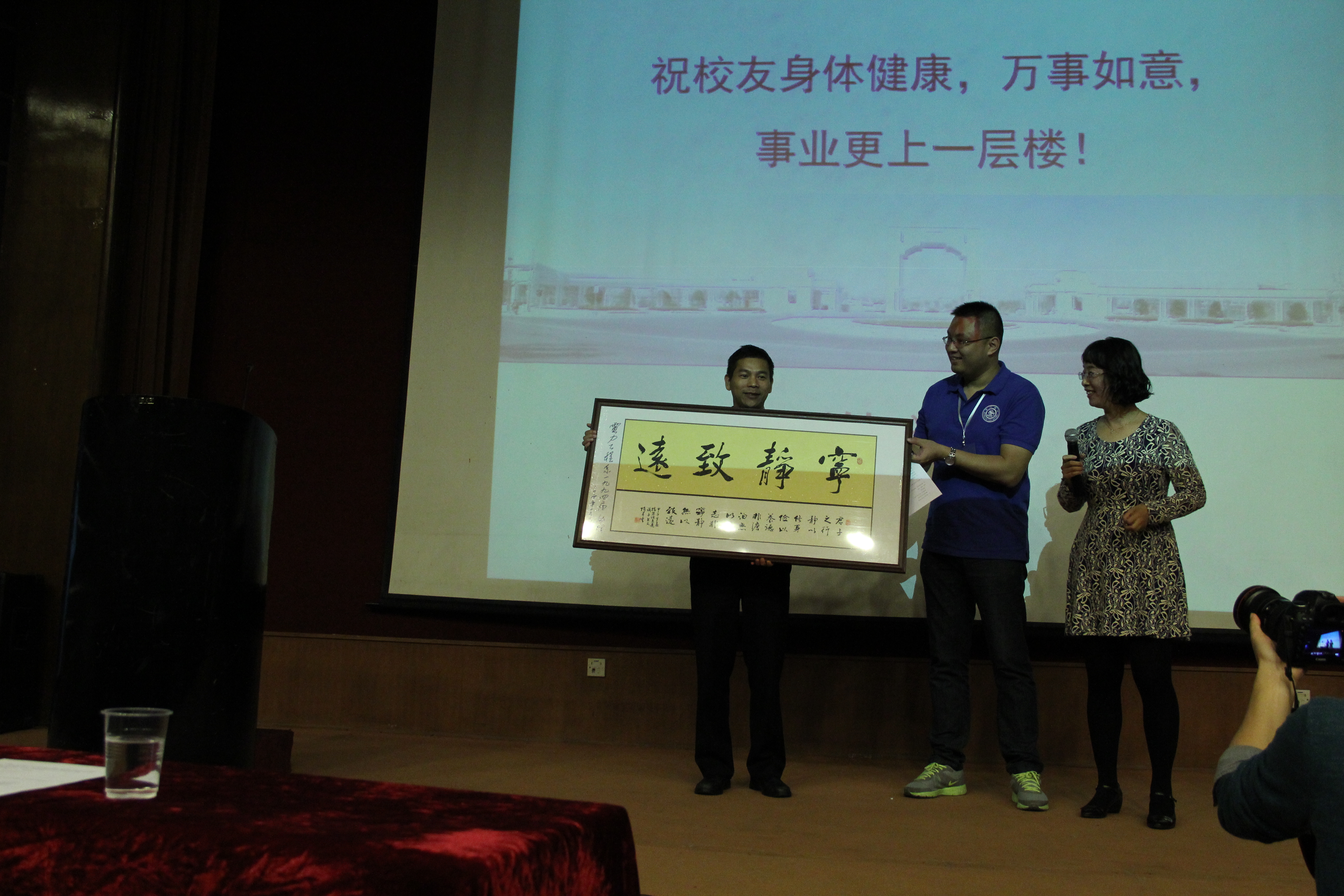 学院副院长邰能灵教授代表学院及电气系对此次校友的聚会表示祝贺,并致以亲切的问候!他说:我们是同龄人,虽毕业于不同学校,但有着相同的专业方向与市场背景,更容易找到共同的话题。并就学院的发展及系情向校友们作了精彩的汇报。校友们敬赠电气系一块“宁静致远”牌匾以示对母校的感激之情,并予以共勉!学院杨一帆副书记、人力资源与国际化办公室田琳老师也一同到会表示庆祝。