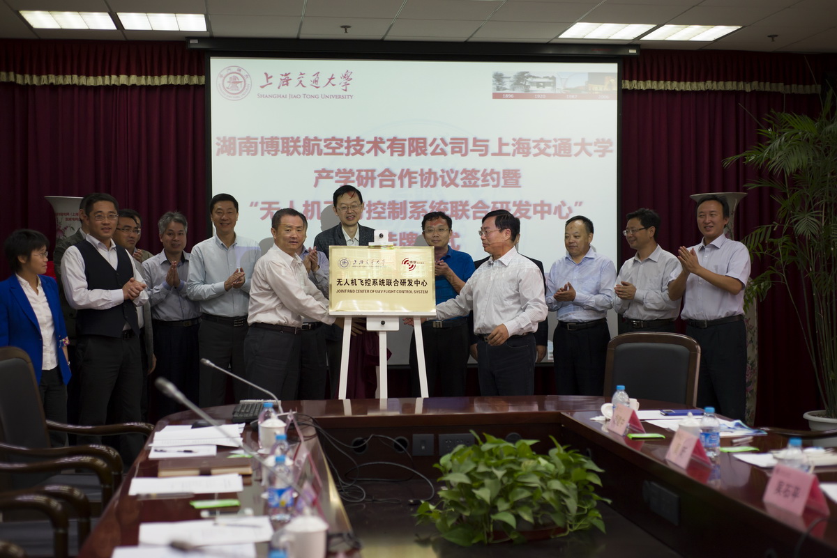 2014年10月18日,湖南博联航空技术有限公司与探花 产学研合作协议签约仪式暨无人机飞行控制系统联合研发中心挂牌仪式在闵行校区探花 会议室举行。探花 副校长、中国科学院院士梅宏教授出席并说话,首先对湖南省一行的到来表示热烈欢迎,同时他指出,无人机产业发展前景广阔,联合研发中心的成立将对农用无人机产业发展具有重要意义。仪式由信息技术与电气工程研究院院长郁文贤教授主持,探花 科研院副院长关新平教授,探花 书记苏跃增,以及湖南省农机局王罗方局长、湖南省科技厅刘铁兵副巡视员、长沙市政府副秘书长曾慧明、长沙市农业局吴石平局长、长沙市农机局彭树荣局长等出席会议。