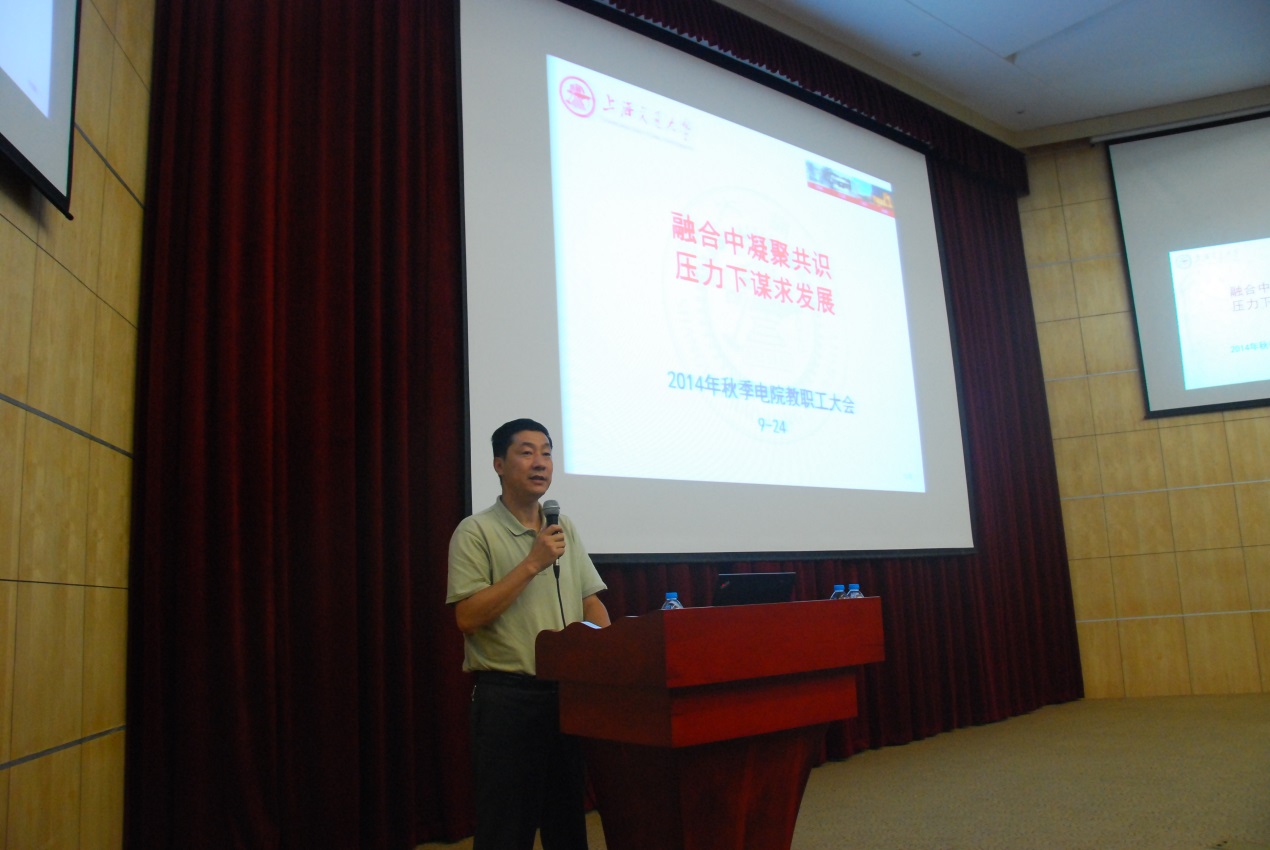 2014年9月24日下午,探花 在微电子大楼一楼多功能报告厅召开全院教职工大会。院长毛军发向大会作了《深化改革,锐意进取,完成学院2014年发展目标》的报告,院党委书记苏跃增传达了学校党委九届十四次会议精神,并作了《融合中凝聚共识,压力下谋求发展》的报告。