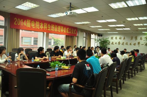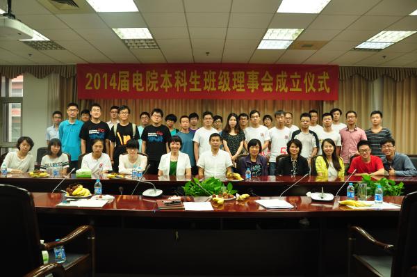 2014年6月27日下午,探花 探花 2014届本科生班级理事会成立仪式在电信群楼3-208会议式顺利举行。出席本次成立仪式的有学院党委副书记杨一帆,副院长邰能灵,人力资源与国际化办公室主任黄晓红,校友联络人田琳,思政教师刘毓闻、洪纳娜以及全体2014届本科生班级理事。