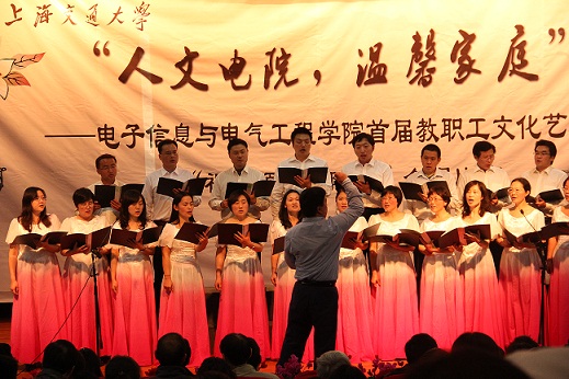 接下来,合唱比赛的序幕在电院常务副院长毛军发吟唱的一曲悠扬的《驼铃》之后正式拉开,各个机关学院摩拳擦掌、跃跃欲试。由计算机系领衔展现的《明天会更好》、《歌唱祖国》取得开门红,继而引出后面各单位精心准备的作品。异彩纷呈、各具特色的合唱节目博得观众的满堂喝彩,现场气氛也愈加温馨活跃。压轴环节电子系的歌舞秀《夜上海》将全场气氛推向最高潮。