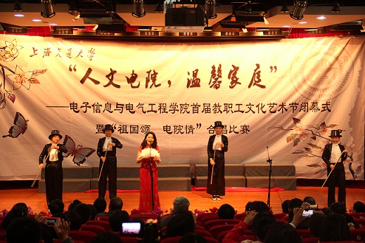 由电院教工合唱团演唱的《阿拉木汗》、《老师,你我共同的名称》作为暖场节目上演之后,现场气氛已然热烈起来。
