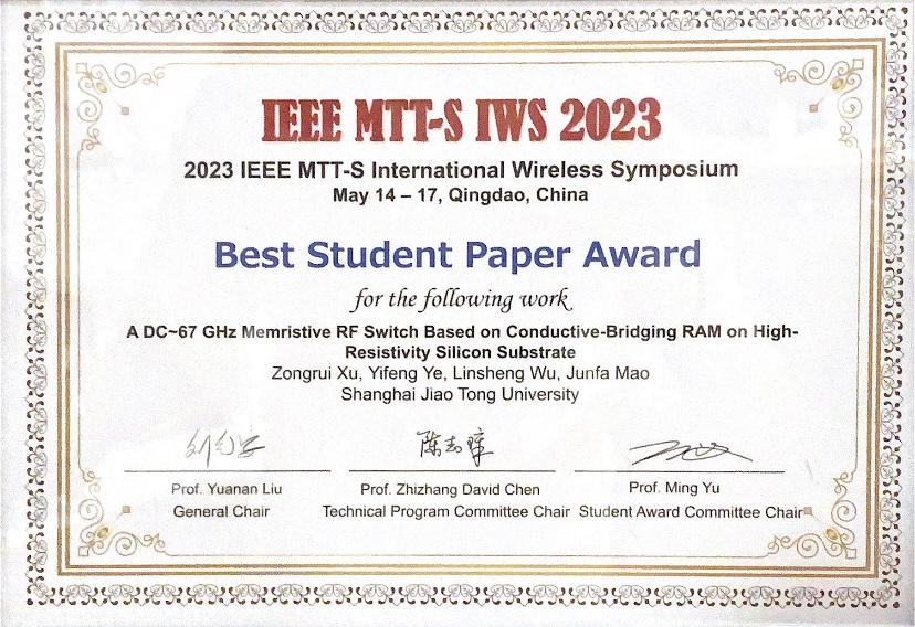 IEEE MTT-S国际无线会议(IWS)是由IEEE微波理论与技术分会与中国电子学会微波分会联合主办的国际微波与无线技术大会。2023年IWS会议共发表论文298篇,主要瞄准与无线系统物理层密切相关的射频微波毫米波器件、电路、系统及其应用方面的最新进展。毛军发团队博士研究生许宗睿等发表的论文“A DC~67 GHz Memristive RF Switch Based on Conductive-Bridging RAM on High-Resistivity Silicon Substrate”从150篇参评学生论文中脱颖而出,被评选为6篇最佳学生获奖论文之一,主要指导教师为吴林晟教授。论文面向智能化可重构射频集成系统需求,基于自主研发的高阻硅衬底上导电桥型忆阻开关工艺,设计研制出一款可工作于DC~67 GHz频段的非易失性射频开关,即可无需持续施加偏置而保持开关的导通/断开状态,具有低损耗和超低功耗的优点。论文还表征了导电桥型射频开关的记忆性、高温烘烤、高温工作等特性。该技术为毫米波三维封装提供了一种低成本、易集成的可重构器件与电路解决方案。