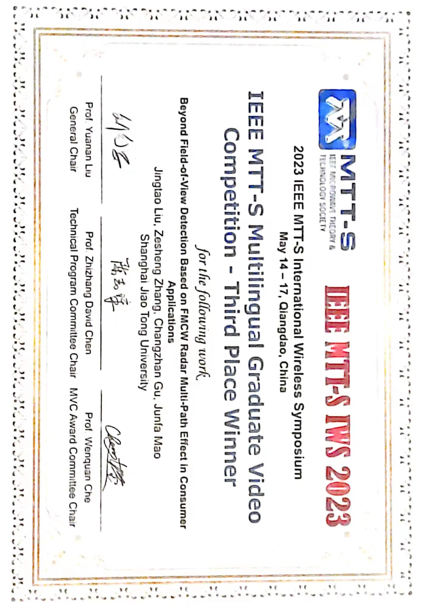 IEEE MTT-S IWS的多语种研究生视频竞赛(Multilingual Graduate Video Competition,MVC)由IEEE MTT-S教育委员会创立于2022年,旨在鼓励学生用母语向非专业观众展示相关研究成果以扩大IEEE MTT-S在世界各地的影响力。毛军发团队博士研究生刘劲涛演讲的论文“Beyond Field-of-View Detection Based on FMCW Radar Multi-Path Effect in Consumer Applications”荣获本届MVC竞赛三等奖,主要指导教师为顾昌展副教授。主要介绍了调频连续波雷达技术如何在复杂多变的场景中进行应用。调频连续波雷达的视场角通常有限,制约了其在消费类场景中的应用,而消费类场景经常出现多径效应。本工作针对上述问题,提出一种用于超视角监测的信道传播模型,并对其原理和工作方式做了分析。办公环境实验表明,基于该信道传播模型方法,即使受试者处于雷达视场角之外,受试者的生命体征和身体运动依然可以被稳定地监测到。