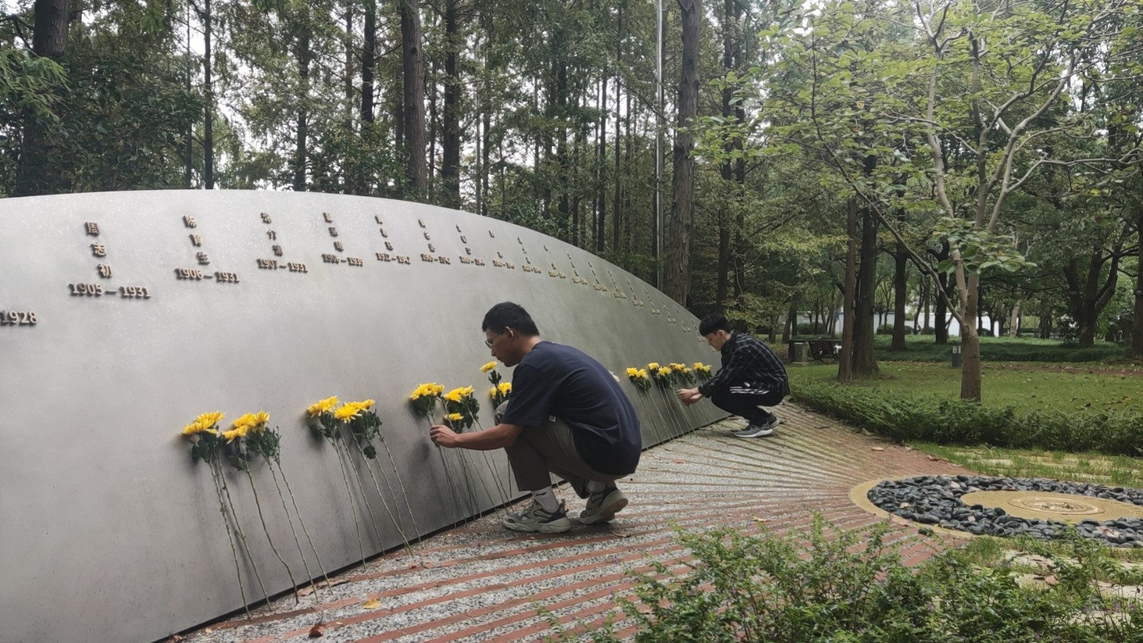 全体同学面向英烈纪念雕塑三鞠躬,并敬献鲜花,表达对交大革命英烈们的无限敬意和哀思。