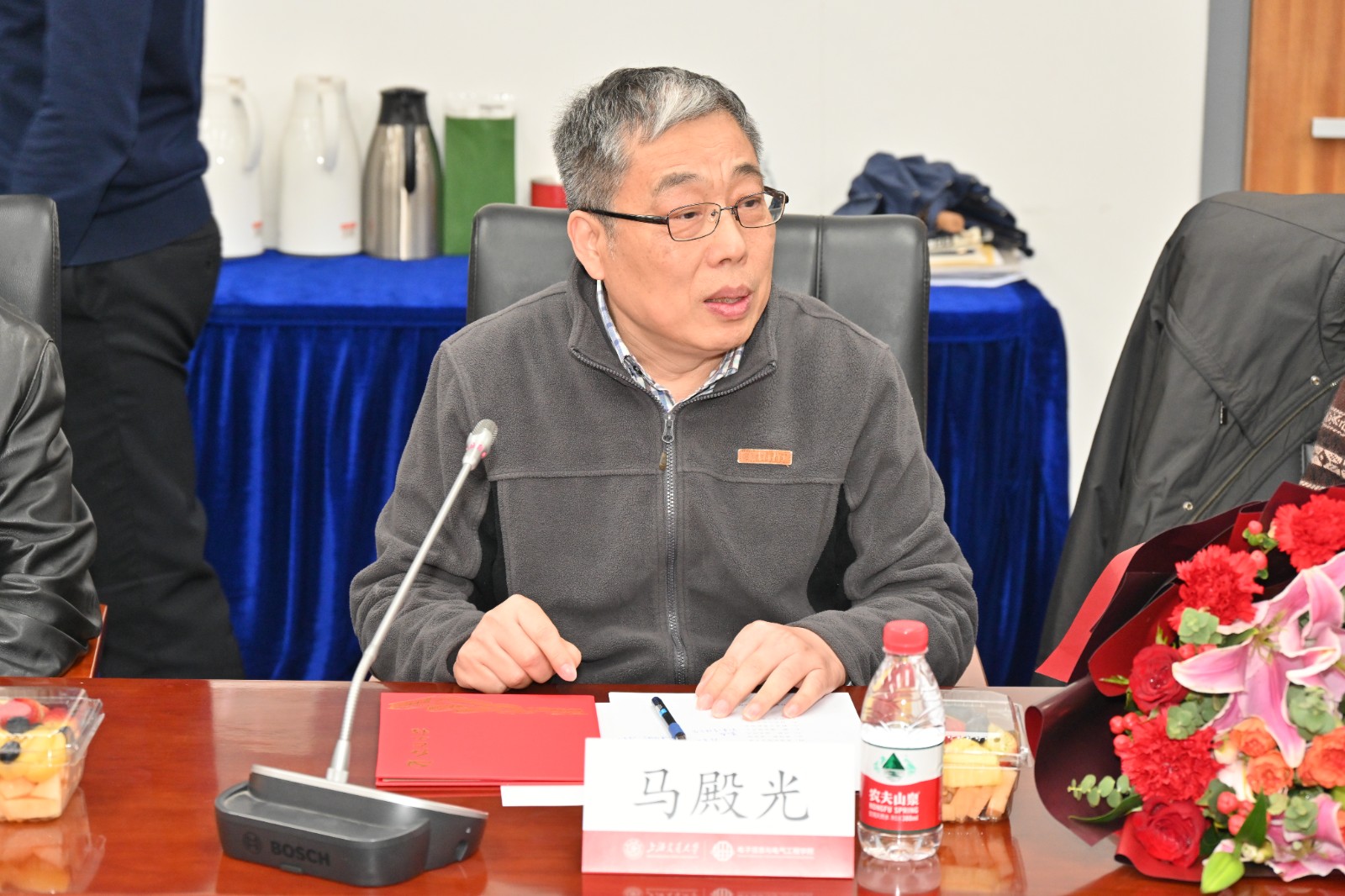 王培丞代表学指委讲话,他表示电院老一届关工委在任时教书育人、退休后发挥余热开展育人工作、关怀下一代并且惠及更多学生的精神值得传承和尊敬,他希望新一届电院关工委持续关心好思政育人和学生党建工作,在学校关工委品牌活动中多出优秀作品。