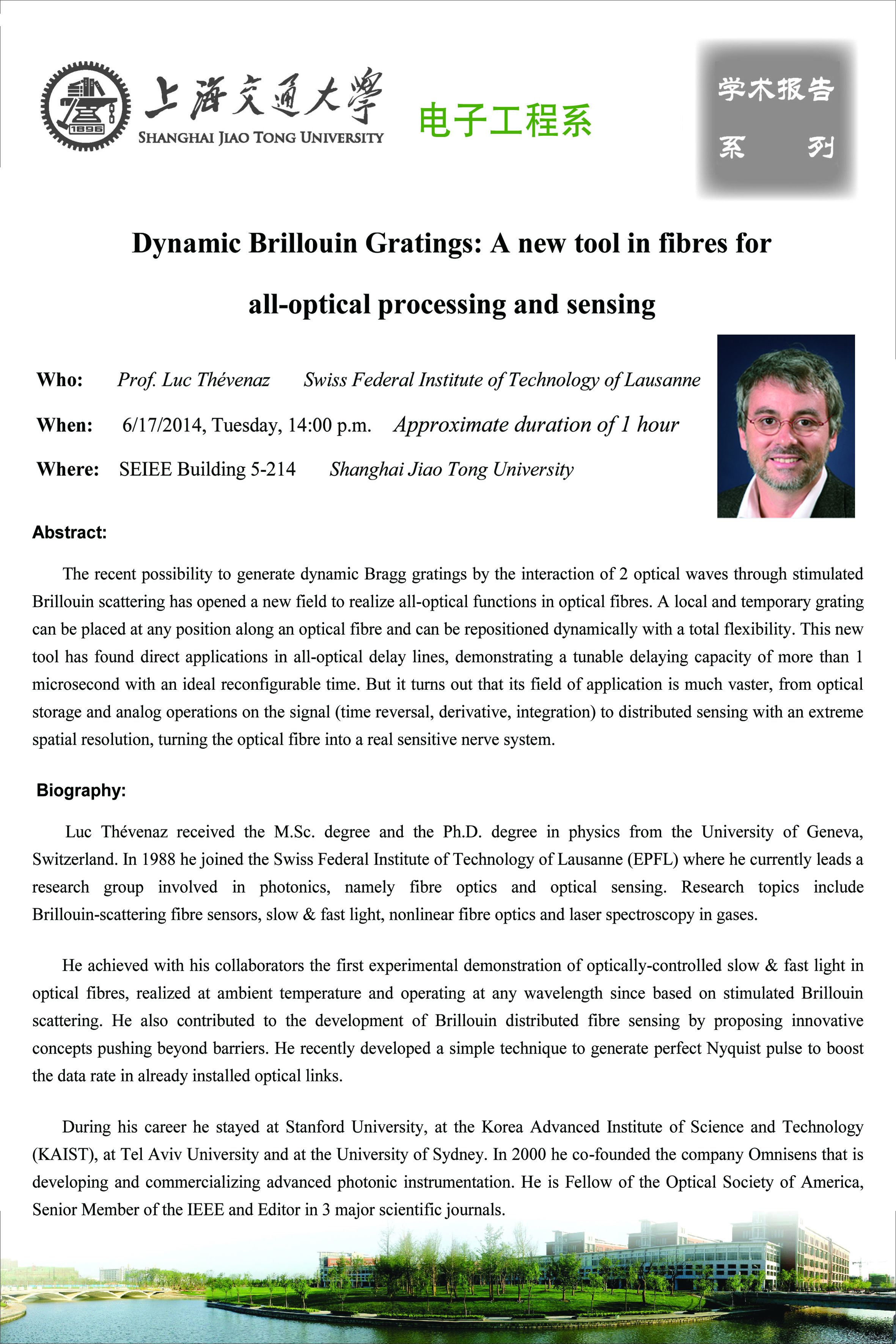 讲演题目:Dynamic Brillouin Gratings: A new tool in fibres for all-optical processing and sensing