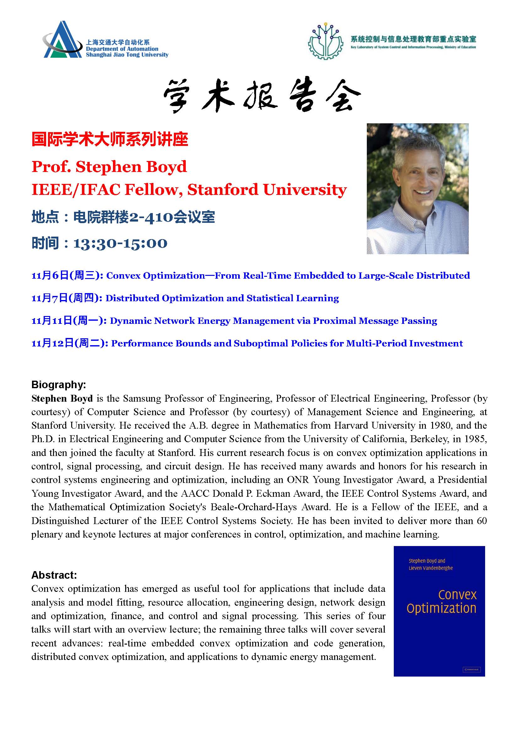 学术报告之国际学术大师系列讲座通知--Stephen Boyd (IEEE/IFAC Fellow, Stanford University, USA)